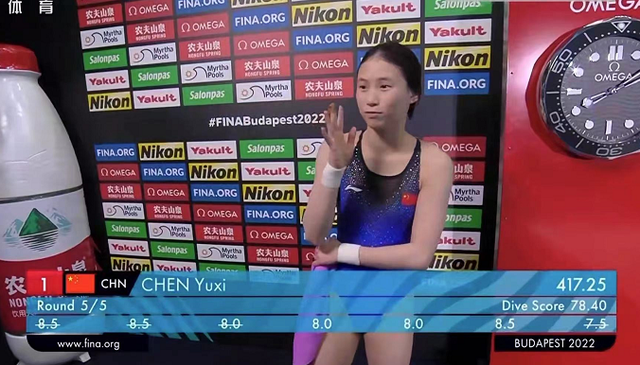 第五轮,全红婵5253B的动作,总分416.95分,排名第二,夺得银牌。陈芋汐最后一跳,5253B,总分417.25分,斩获金牌,恭喜。