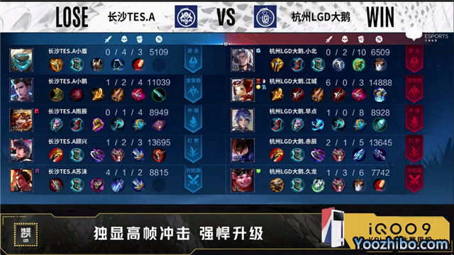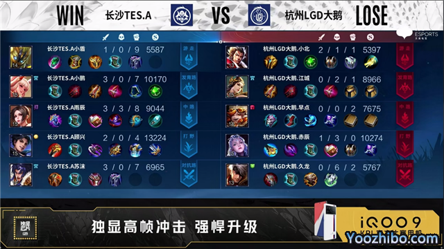 开局双方选择多路换线。1分26秒长沙TES.A中路击杀吕布拿下一血。2分39秒发育路团长沙TES.A打出0换2。3分21秒长沙TES.A对抗路击杀不知火舞。3分35秒杭州LGD大鹅拿下暴君。4分15秒杭州LGD大鹅发育路击杀蒙恬。5分11秒长沙TES.A摧毁敌方对抗路外塔。6分02秒杭州LGD大鹅对抗路击杀马可波罗。6分47秒杭州LGD大鹅摧毁敌方对抗路外塔。7分55秒长沙TES.A拿下暴君。9分30秒野区团长沙TES.A打出0换2。10分11秒长沙TES.A拿下暗影主宰。10分51秒杭州LGD大鹅中路击杀弈星。11分14秒杭州LGD大鹅拿下暗影暴君。11分44秒长沙TES.A野区击杀大乔。12分20秒长沙TES.A高地团打出0换2后摧毁水晶拿下比赛。