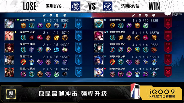 54秒,上路团,双方1换1。2分19秒,深圳DYG拿下暴君。3分钟,上路团,双方打出1换1。3分15秒,济南RW侠下路击杀周瑜,随后深圳DYG破掉济南RW侠上一塔。4分10秒,深圳DYG拿下先知主宰。5分钟,下路团,双方1换1。5分28秒,深圳DYG破掉济南RW侠下一塔。6分钟,济南RW侠破掉深圳DYG下一塔。6分20秒,中路团,深圳DYG打出1换2,随后控下暴君。7分42秒,深圳DYG破掉济南RW侠中一塔。8分钟,济南RW侠先后破掉深圳DYG上二塔和中一塔。8分28秒,济南RW侠拿下主宰。9分10秒,中路团,深圳DYG击杀西施。10分14秒,深圳DYG控下暗影暴君。10分33秒,主宰团,深圳DYG打出0换1。11分47秒,济南RW侠控下暗影主宰。13分14秒,济南RW侠破掉深圳DYG上一塔后击杀蒙恬。14分20秒,野区团,济南RW侠打出1换2。15分钟,济南RW侠破掉深圳DYG下路高地塔。15分32秒,济南RW侠拿下暗影主宰。16分钟,下路团,济南RW侠击杀蒙恬。16分40秒,济南RW侠破掉深圳DYG中路高地塔。17分钟,济南RW侠上路击杀赵云。17分40秒,野区团,双方打出1换1。19分22秒,济南RW侠拿下暗影主宰。20分40秒,风暴龙王团,深圳DYG打出0换1。22分钟,济南RW侠橘右京上路一波摧毁水晶拿下本场比赛的胜利。