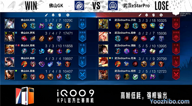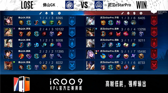 双方常规开局。2分25秒武汉eStar发育路击杀马可波罗拿到一血。3分04秒武汉eStar拿下暴君。4分40秒武汉eStar拿下主宰。4分58秒佛山GK中路击杀不知火舞。5分32秒双方对抗路射手互换。7分14秒中路团战武汉eStar击杀弈星。7分32秒武汉eStar拿下暴君。8分10秒武汉eStar野区击杀弈星。8分31秒武汉eStar摧毁敌方对抗路二塔。9分59秒野区双方1换1。10分14秒佛山GK打出1换3。10分42秒佛山GK拿下暗影暴君。佛山GK野区马可波罗单杀鲁班大师。12分24秒佛山GK拿下暗影主宰,武汉eStar击杀马可波罗。14分36秒武汉eStar暴君处击杀关羽。14分52秒武汉eStar拿下暗影暴君。15分14秒武汉eStar击杀弈星并摧毁敌方发育路高地塔。16分27秒武汉eStar拿下暗影主宰。17分30秒野区团战佛山GK击杀不知火舞。17分53秒武汉eStar野区打出0换2。18分57秒武汉eStar拿下暗影暴君。19分48秒佛山GK中路击杀澜。20分31秒佛山GK野区击杀鲁班七号。21分19秒佛山GK拿下风暴龙王。22分47秒高地团战佛山GK打出0换4。22分59秒佛山GK摧毁敌方水晶拿下比赛。