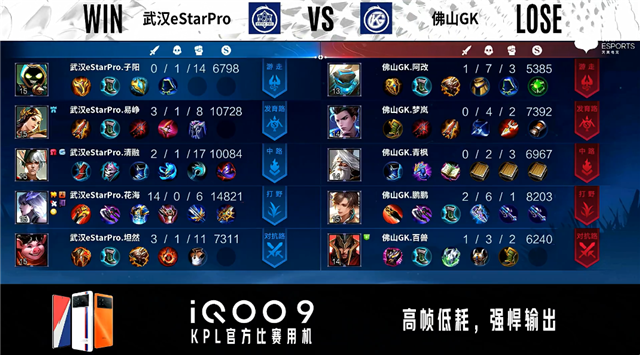 双方常规开局。1分24秒武汉eStar中路击杀裴擒虎拿到一血。2分09秒武汉eStar对抗路击杀裴擒虎。3分02秒武汉eStar野区打出0换3。3分46秒佛山GK暴君处击杀桑启。4分14秒佛山GK摧毁敌方发育路外塔。5分11秒武汉eStar野区打出0换2。5分35秒武汉eStar摧毁敌方中路外塔。5分59秒武汉eStar对抗路打出0换2。7分36秒武汉eStar拿下主宰。6分10秒武汉eStar摧毁敌方对抗路二塔。9分58秒武汉eStar团灭对手摧毁水晶拿下比赛。