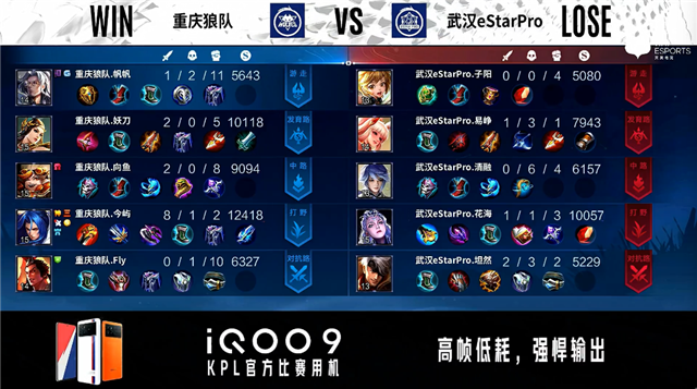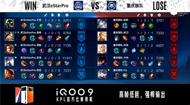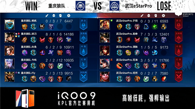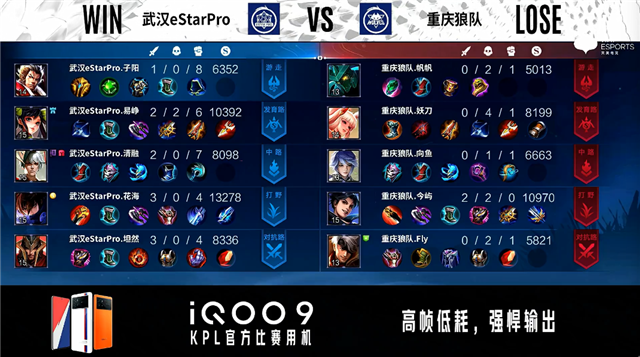 双方常规开局。2分39秒武汉eStar野区击杀不知火舞拿到一血。4分06秒野区团战双方1换1。4分32秒重庆狼队反掉敌方蓝BUFF。5分29秒武汉eStar拿下主宰。6分22秒野区团战武汉eStar打出3换4,娜可露露拿到三连决胜。7分59秒武汉eStar拿下暴君。8分46秒重庆狼队对抗路击杀娜可露露。9分14秒重庆狼队暴君处击杀周瑜。10分16秒重庆狼队拿下暗影主宰,武汉eStar拿下暗影暴君。11分20秒武汉eStar打出2换3。11分48秒重庆狼队击杀周瑜并摧毁敌方对抗路二塔。12分14秒重庆狼队野区击杀娜可露露。12分49秒重庆狼队摧毁敌方中路二塔、发育路二塔。14分25秒暴君处团战双方1换1。15分04秒武汉eStar拿下暗影暴君,重庆狼队打出1换3。15分45秒重庆狼队摧毁敌方发育路高地塔。16分32秒野区团战重庆狼队打出0换2。17分19秒重庆狼队摧毁敌方水晶拿下比赛。
