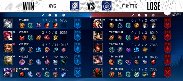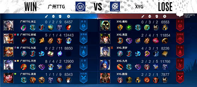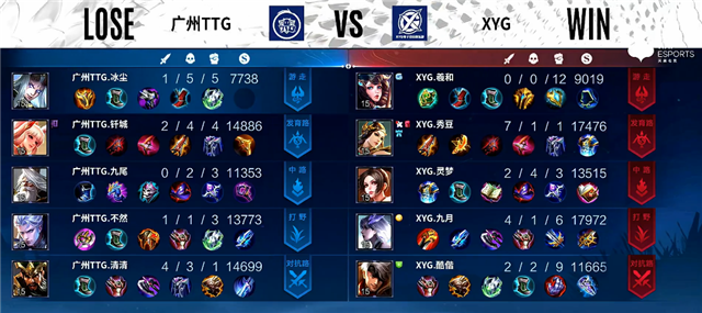 3分钟上路团战,猪八戒拿下一血,弈星拿下三杀,XYG打出1换3。4分钟橘右京拿下主宰。5分30秒下路团战,XYG打出1换2。7分钟上路团战,广州TTG打出0换4,鲁班七号推掉上路一塔。7分50秒鲁班七号推掉中路一塔。8分10秒镜拿下主宰。9分40秒橘右京拿下暴君。11分钟镜被击杀,橘右京拿下暴君。11分55秒鲁班七号拿下主宰。14分钟高地团战,广州TTG打出1换2,鲁班七号推掉中上2路高地塔。15分15秒镜拿下暴君,团战广州TTG打出2换4。16分钟广州TTG推掉水晶追回一分。