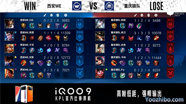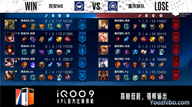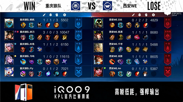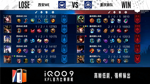 双方常规开局。1分01秒西安WE反到蓝BUFF。2分04秒重庆狼队发育路击杀太乙真人拿到一血。2分30秒重庆狼队拿下暴君。4分39秒重庆狼队摧毁敌方发育路外塔。5分23秒野区团战西安WE击杀盾山。6分53秒西安WE野区击杀百里守约。7分25秒西安WE拿下暴君。10分21秒重庆狼队拿下暗影主宰。11分04秒重庆狼队摧毁敌方中路外塔、二塔。12分09秒西安WE发育路击杀梦奇。12分35秒重庆狼队抢到暗影暴君并打出0换3。13分16秒重庆狼队团灭对手摧毁水晶拿下比赛。