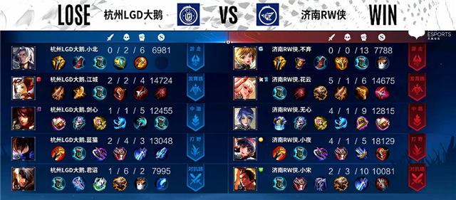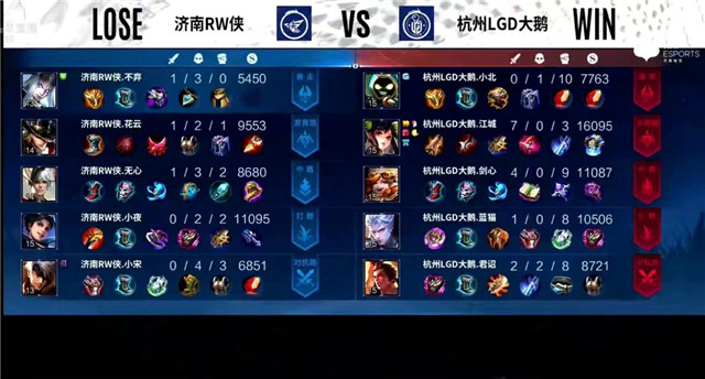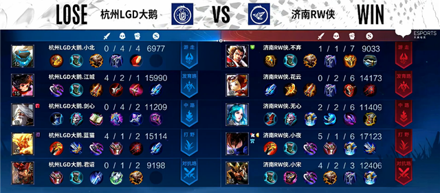 2分钟下路团战,盘古拿下一血。3分40秒盘古拿下主宰,澜拿下暴君。5分钟下路团战,济南RW侠打出0换2,鲁班七号推掉下路一塔。6分30秒双方互换边路一塔。8分钟盘古拿下暴君。8分50秒中路团战,杭州LGD大鹅打出1换4。9分钟李元芳推掉中路一塔。9分40秒盘古拿下主宰。10分30秒盘古拿下暴君,澜拿下主宰。14分钟澜拿下主宰,鲁班七号被击杀。15分15秒盘古拿下暴君。16分钟下路团战,关羽拿下双杀。16分30秒鲁班七号推掉中路一塔。17分40秒河道团战,双方2换2。18分20秒澜拿下主宰。19分钟鲁班七号推掉上路高地塔。21分钟高地团战,济南RW侠打出0换2。21分24秒济南RW侠推掉水晶拿下本场比赛胜利。