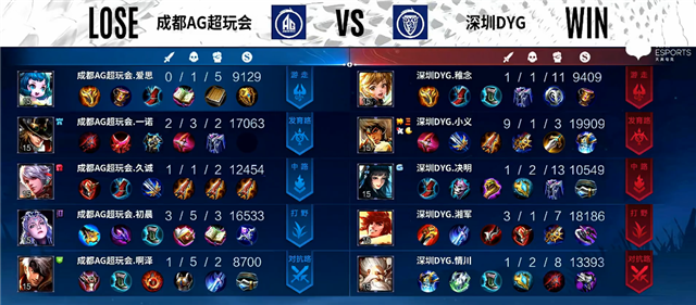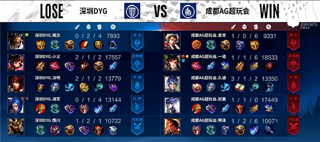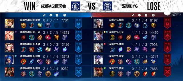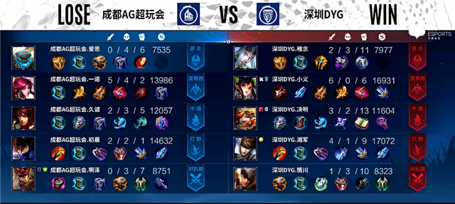 2分20秒镜拿下主宰。4分10秒深圳DYG上路一塔被破。4分32秒橘右京拿下暴君。5分20秒双方互换边路一塔。7分30秒镜拿下暴君。8分钟野区团战,镜拿下一血,双方1换1。9分30秒橘右京拿下暴君。10分12秒镜拿下主宰。12分15秒镜抢下暴君,蒙恬被击杀。12分44秒狄仁杰推掉中路一塔。14分19秒橘右京推掉中路一塔,蒙恬被击杀。15分钟镜拿下主宰。18分20秒中路团战,成都AG超玩会团灭深圳DYG,顺势中路一波推掉水晶率先拿下赛点。