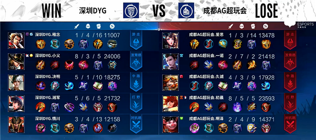 2分10秒深圳DYG入侵野区,西施拿下一血。2分27秒裴擒虎拿下主宰。3分钟露娜拿下暴君。5分40秒双方互换边路一塔,露娜被击杀。7分30秒露娜拿下主宰。8分40秒露娜拿下暴君。9分钟马可波罗推掉中路一塔。10分15秒马可波罗拿下暴君。11分钟老夫子被击杀,百里守约推掉中路二塔。11分22秒百里守约推掉上路高地塔。12分16秒马可波罗拿下主宰。13分50秒上路团战,双方1换1。14分26秒露娜拿下暴君。17分钟高地团,深圳DYG打出1换4。17分30秒成吉思汗推掉中路一塔。18分钟裴擒虎拿下暴君。21分钟野区团战,深圳DYG打出1换3。21分50秒裴擒虎拿下风暴龙王。23分06秒深圳DYG推掉水晶拿下本场比赛胜利。
