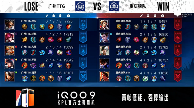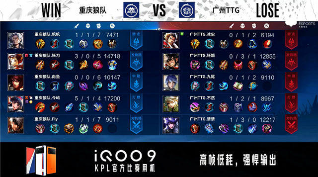 双方常规开局。2分20秒重庆狼队拿下暴君并击杀牛魔。3分13秒广州TTG发育路击杀狄仁杰。4分385分13秒重庆狼队对抗路击杀娜可露露。5分39秒重庆狼队对抗路击杀沈梦溪。5分50秒重庆狼队摧毁敌方对抗路外塔。6分12秒重庆狼队发育路澜单杀娜可露露。6分52秒重庆狼队摧毁敌方中路外塔。7分02秒重庆狼队拿下暴君。7分18秒重庆狼队摧毁敌方发育路二塔。8分30秒重庆狼队摧毁敌方对抗路二塔。9分26秒重庆狼队拿下主宰。10分33秒重庆狼队拿下暗影暴君。11分29秒重庆狼队拿下暗影主宰。11分18秒重庆狼队摧毁敌方中路二塔。12分31秒重庆狼队摧毁敌方发育路高地塔。13分29秒重庆狼队摧毁敌方对抗路高地塔。14分45秒重庆狼队拿下暗影暴君。15分27秒重庆狼队拿下暗影主宰。16分21秒重庆狼队摧毁敌方中路高地塔,广州TTG击杀吕布。18分26秒广州TTG拿下暗影暴君,重庆狼队击杀娜可露露。19分19秒高地团战广州TTG打出1换3。19分58秒双方中路互换法师。20分44秒中路团战广州TTG打出1换2。22分37秒重庆狼队拿下风暴龙王。23分39秒高地团战重庆狼队打出换5。24分整重庆狼队摧毁敌方水晶拿下比赛。