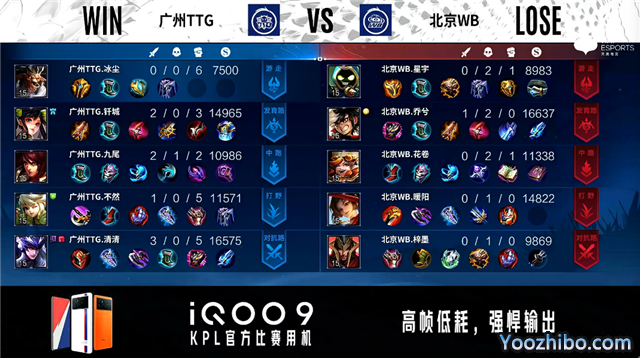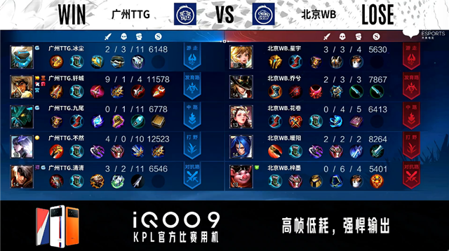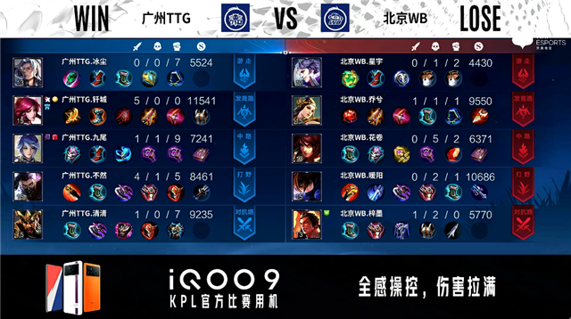 开局北京WB中路公孙离抢线。1分29秒北京WB中路击杀孙膑拿到一血。2分12秒北京WB拿下暴君。2分51秒广州TTG中路击杀弈星。5分22秒北京WB拿下主宰。5分41秒北京WB摧毁敌方发育路外塔。7分43秒北京WB中路打出0换2并摧毁敌方中路外塔。8分03秒北京WB摧毁敌方发育路二塔。9分28秒北京WB摧毁敌方中路二塔。9分41秒北京WB摧毁敌方对抗路二塔。9分55秒北京WB拿下主宰。10分20秒北京WB拿下暗影主宰。11分25秒北京WB摧毁敌方中路高地塔。12分05秒北京WB拿下暗影暴君。12分56秒北京WB摧毁敌方发育路高地塔。14分07秒北京WB拿下暗影主宰。15分17秒北京WB摧毁敌方水晶拿下比赛。