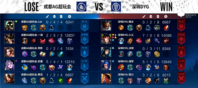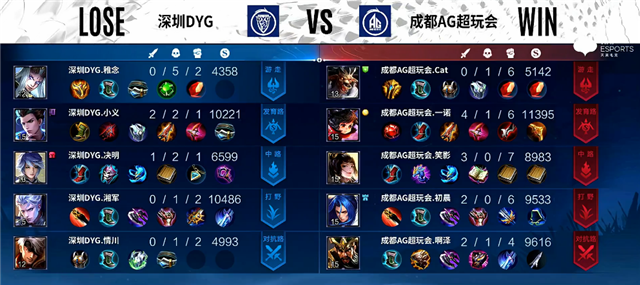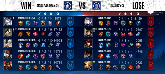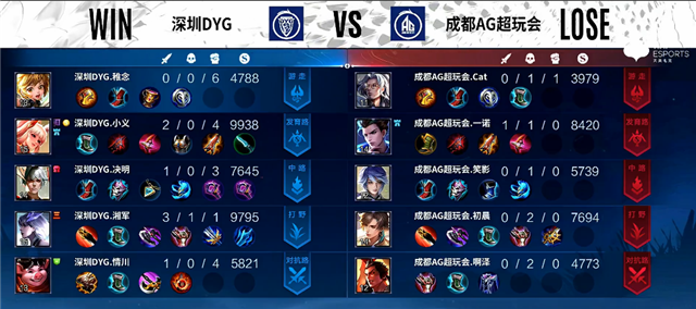 开局深圳DYG入侵野区拿下红Buff。2分20秒东皇太一抢下暴君。2分40秒下路团战,蒙犽拿下一血。3分34秒下路团战,双方1换1。4分11秒虞姬被击杀。4分37秒蒙犽推掉下路一塔。5分钟澜拿下主宰。6分钟野区团战,澜被击杀。7分钟赵云被击杀。7分24秒澜拿下暴君。8分42秒澜拿下主宰。10分钟暴君团,双方3换3。11分钟蒙犽推掉下路二塔。11分15秒蒙犽推掉中路一塔。12分10秒澜拿下暴君。13分钟上路团战,双方1换1。14分钟澜拿下主宰,东皇太一被击杀。15分55秒澜拿下暴君。17分钟嬴政推掉中路一塔。18分钟赵云拿下主宰。19分钟中路团战,成都AG超玩会打出0换2。20分钟成都AG超玩会推掉中下两路高地塔。21分35秒赵云拿下风暴龙王,团战成都AG超玩会打出0换2。22分18秒高地团战,成都AG超玩会打出0换4团灭深圳DYG。22分38秒成都AG超玩会推掉水晶追平比分。