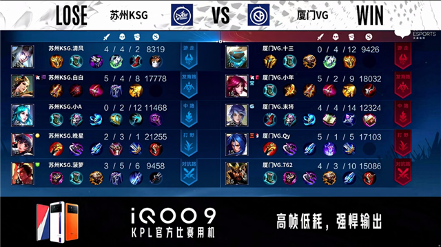 2分10秒,苏州KSG伽罗击杀东皇太一拿下一血。2分27秒,苏州KSG控下暴君。3分39秒,厦门VG橘右京击杀吕布,随后关羽再击杀娜可露露。4分45秒,双方团,苏州KSG打出0换2。5分10秒,苏州KSG吕布下路击杀关羽。6分50秒,苏州KSG控下暴君,随后破掉厦门VG下一塔。8分47秒,中路团,苏州KSG击杀弈星,随后控下先知主宰。9分17秒,苏州KSG破掉厦门VG上一塔。10分20秒,厦门VG橘右京抢到暗影暴君。11分48秒,厦门VG击杀娜可露露,随后破掉苏州KSG上二塔。12分06秒,厦门VG控下暗影主宰。12分15秒,厦门VG破掉苏州KSG中一塔。13分16秒,双方团,厦门VG打出1换2。13分57秒,厦门VG破掉苏州KSG中二塔。15分43秒,双方团战1换1,厦门VG破掉苏州KSG下二塔。16分17秒,厦门VG控下暗影暴君。17分20秒,厦门VG破掉苏州KSG上高地。17分58秒,厦门VG击杀吕布。18分30秒,厦门VG破掉苏州KSG下高地。18分45秒,厦门VG控下暗影暴君。19分45秒,双方团战4换4。21分47秒,双方团,苏州KSG打出1换2。23分20秒,双方团,厦门VG打出2换5团灭对手。23分50秒,厦门VG中路一波摧毁苏州KSG水晶赢下比赛。