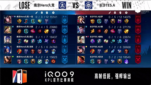 1分51秒,长沙TES.A沈梦溪上路越塔击杀蒙恬拿下一血。2分14秒,南京Hero久竞控下暴君。2分45秒,长沙TES.A露娜击杀裴擒虎。3分10秒,南京Hero久竞拿下先知主宰,长沙TES.A团战打出0换2。4分42秒,长沙TES.A下路击杀周瑜,随后南京Hero久竞破掉长沙TES.A上一塔。7分17秒,长沙TES.A破掉南京Hero久竞中一塔。7分41秒,野区团,长沙TES.A打出1换2。7分57秒,长沙TES.A破掉南京Hero久竞中二塔。8分12秒,长沙TES.A破掉南京Hero久竞下二塔。8分30秒,长沙TES.A破掉南京Hero久竞上一塔。9分20秒,上路团,长沙TES.A打出1换2并破掉南京Hero久竞上二塔。10分13秒,长沙TES.A控下暗影主宰。11分30秒,下路团,长沙TES.A打出1换4并破掉南京Hero久竞下高地。11分48秒,长沙TES.A下路一波摧毁南京Hero久竞水晶赢下比赛。