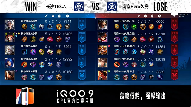 1分钟,上路团,双方1换1。2分09秒,南京Hero久竞控下暴君。2分20秒,长沙TES.A下路击杀大乔。4分14秒,南京Hero久竞控下先知主宰。7分14秒,南京Hero久竞控下暴君并破掉长沙TES.A下一塔,随后长沙TES.A控下南京Hero久竞上一塔。10分06秒,南京Hero久竞橘右京中路击杀嬴政。10分34秒,南京Hero久竞控下暗影主宰。10分50秒,南京Hero久竞破掉长沙TES.A中一塔。12分12秒,南京Hero久竞破掉长沙TES.A中一塔。13分钟,南京Hero久竞控下暗影暴君。13分45秒,下路团,南京Hero久竞打出2换3。14分52秒,南京Hero久竞控下暗影主宰。15分27秒,南京Hero久竞上路击杀张飞。15分43秒,南京Hero久竞破掉长沙TES.A上高地。16分10秒,南京Hero久竞破掉长沙TES.A中高地。17分06秒,南京Hero久竞控下暗影暴君。18分25秒,双方团,长沙TES.A打出1换2。19分07秒,长沙TES.A控下暗影主宰。20分40秒,双方团,长沙TES.A击杀虞姬后控下风暴龙王。21分30秒,长沙TES.A破掉南京Hero久竞中一塔。21分51秒,长沙TES.A破掉南京Hero久竞上二塔。23分13秒,南京Hero久竞强推掉长沙TES.A下高地。24分25秒,南京Hero久竞弈星抢到风暴龙王。25分26秒,高地团,长沙TES.A打出2换5团灭对手。26分16秒,长沙TES.A破掉南京Hero久竞下高地。28分10秒,长沙TES.A控下风暴龙王。30分40秒,长沙TES.A破掉南京Hero久竞上高地。31分40秒,双方团,南京Hero久竞打出2换3。33分08秒,长沙TES.A控下风暴龙王。34分47秒,长沙TES.A破掉南京Hero久竞中高地。34分49秒,长沙TES.A下路击杀橘右京。36分32秒,长沙TES.A控下风暴龙王。37分51秒,长沙TES.A边团边拆摧毁南京Hero久竞水晶先下一城。