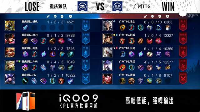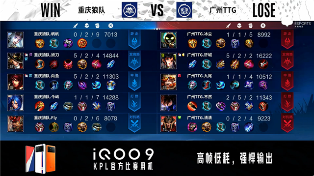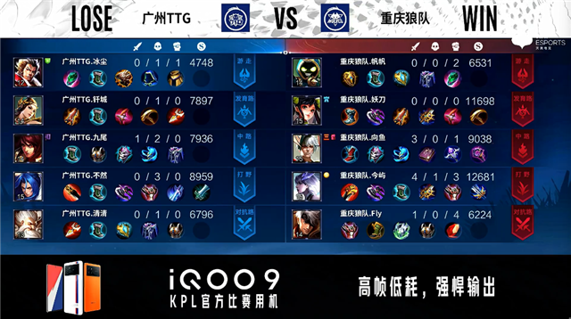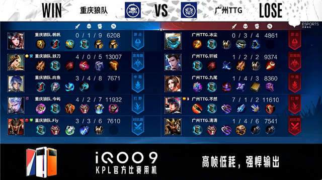 开局广州TTG中路关羽抢线。2分14秒重庆狼队拿下暴君。3分17秒中路团战双方1换1。3分47秒重庆狼队抢到主宰,团战双方1换1。4分20秒重庆狼队对抗路击杀盾山。4分43秒广州TTG对抗路打出0换2。5分15秒对抗路双方1换1。6分26秒广州TTG拿下暴君。8分10秒广州TTG抢到主宰。6分25秒广州TTG野区击杀铠,重庆狼队摧毁敌方中路外塔。8分49秒广州TTG发育路击杀大乔。9分39秒重庆狼队野区击杀盾山。9分57秒中路团战重庆狼队打出1换3。10分45秒广州TTG对抗路击杀弈星。12分13秒野区团战双方1换1。14分09秒中路团战重庆狼队击杀关羽。14分42秒重庆狼队发育路击杀娜可露露。15分11秒重庆狼队高地团战打出0换3。15分重庆狼队摧毁敌方水晶拿下比赛。