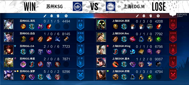 2分24秒中路团,镜拿下一血。3分13秒镜拿下暴君。4分12秒李元芳推掉下路一塔。5分钟橘右京拿下主宰。7分钟橘右京推掉下路一塔。8分钟镜拿下暴君。9分13秒嬴政拿下主宰。10分27秒镜拿下主宰。12分钟镜拿下暴君。13分10秒中路团战,苏州KSG打出0换2。13分37秒嬴政推掉中路一塔。14分20秒镜拿下主宰。15分40秒李元芳推掉推掉下路高地塔,团战团灭上海EDG.M。16分16秒苏州KSG推掉水晶率先拿下赛点。