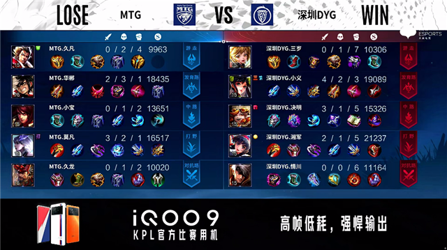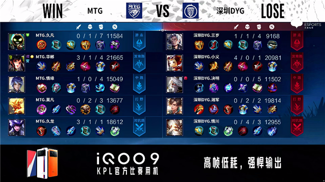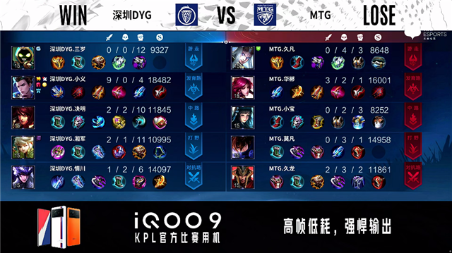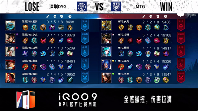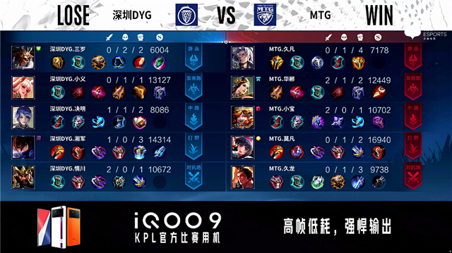2分43秒,深圳DYG控下暴君。3分45秒,双方团战1换1,MTG控下先知主宰。5分04秒,深圳DYG破掉MTG下一塔,随后MTG破掉深圳DYG上一塔。7分钟,MTG控下暴君。7分30秒,深圳DYG破掉MTG中一塔。8分20秒,深圳DYG控下先知主宰,随后破掉MTG上二塔。8分47秒,双方团,深圳DYG打出0换2。9分17秒,深圳DYG击杀澜。10分19秒,深圳DYG控下暗影暴君。10分47秒,深圳DYG破掉MTG下、中二塔。11分20秒,深圳DYG控下暗影主宰。11分56秒,深圳DYG破掉MTG上高地。12分58秒,深圳DYG破掉MTG下高地。14分02秒,深圳DYG控下暗影暴君。14分34秒,MTG中高地反打击杀阿古朵。15分30秒,中路团,深圳DYG打出2换3。16分钟,深圳DYG破掉MTG中高地并击杀西施。16分53秒,深圳DYG控下暗影主宰。18分02秒,深圳DYG控下暗影暴君。19分03秒,高地团,双方1换1。20分30秒,MTG澜抢到风暴龙王,随后团战深圳DYG打出0换5团灭对手。20分58秒,深圳DYG一波摧毁MTG水晶扳回一城。