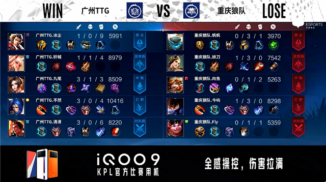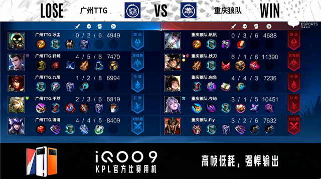 开局广州TTG公孙离中路抢线。2分15秒广州TTG拿下暴君。3分16秒野区团战广州TTG打出1换3。3分58秒重庆狼队发育路击杀不知火舞。6分14秒广州TTG野区击杀澜。7分20秒广州TTG对抗路击杀沈梦溪并摧毁对抗路二塔。8分35秒野区团战广州TTG打出0换2。8分49秒广州TTG摧毁敌方对抗路高地塔。11分58秒中路团战广州TTG打出0换2并摧毁中路二塔。12分34秒广州TTG摧毁敌方水晶拿下比赛。