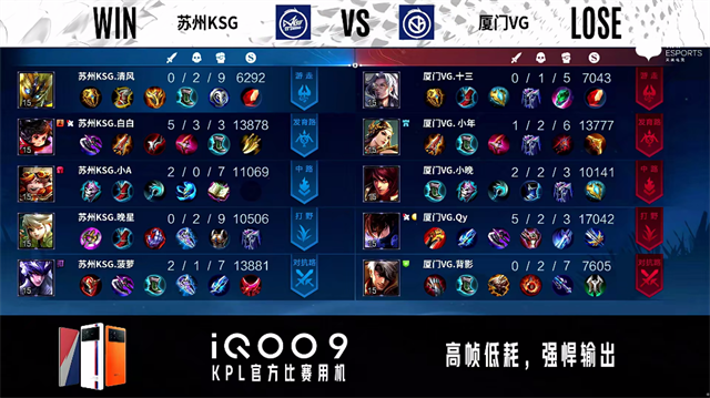 1分36秒,苏州KSG周瑜击杀暃拿下一血。3分03秒,苏州KSG拿下暴君。4分38秒,苏州KSG破掉厦门VG下一塔。5分30秒,厦门VG控下先知主宰。7分18秒,苏州KSG破掉厦门VG中一塔。7分58秒,苏州KSG控下暴君。8分57秒,苏州KSG团战打出0换2,随后破掉厦门VG中二塔。9分15秒,苏州KSG击杀孙膑,随后破掉厦门VG上高地。10分16秒,苏州KSG控下暗影主宰。10分55秒,苏州KSG破掉厦门VG下二塔。11分16秒,苏州KSG团战打出0换2并破掉厦门VG中、下高地,随后一波摧毁厦门VG水晶率先拿到赛点。