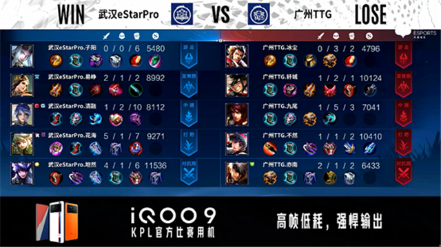 双方常规开局。2分17秒武汉eStar拿下暴君。2分28秒广州TTG拿下主宰。2分36秒广州TTG发育路击杀张飞拿到一血。4分17秒武汉eStar发育路击杀虞姬。5分03秒广州TTG发育路击杀周瑜,中路击杀张飞。6分31秒武汉eStar拿下暴君。7分06秒武汉eStar拿下主宰。8分36秒武汉eStar摧毁敌方中路外塔。9分43秒双方发育路1换1。10分44秒武汉eStar拿下暗影暴君。11分12秒武汉eStar主宰处打出1换2。12分45秒双方发育路1换1。13分38秒发育路团战武汉eStar击杀虞姬。14分47秒武汉eStar拿下暗影暴君。15分02秒武汉eStar野区击杀橘右京。15分36秒武汉eStar发育路击杀虞姬。15分51秒高地团战双方1换1,武汉eStar破掉敌方中路、对抗路发育塔。18分46秒高地团战广州TTG打出0换3。21分28秒中路团战广州TTG打出0换2。22分28秒广州TTG拿下风暴龙王。23分37秒广州TTG摧毁敌方对抗路高地塔。25分09秒广州TTG对抗路击杀沈梦溪。25分35秒广州TTG摧毁敌方中路高地塔。26分06秒广州TTG拿下风暴龙王,野区团战广州TTG打出1换2。27分02秒广州TTG团灭对手摧毁水晶拿下比赛。