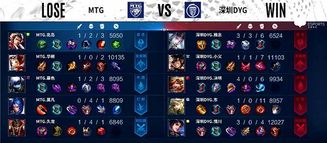 开局MTG入侵蓝区拿下蓝Buff。2分40秒MTG再次入侵野区,娜可露露拿下一血。3分钟娜可露露拿下主宰。4分40秒裴擒虎拿下暴君。5分40秒深圳DYG强攻下路一塔,伽罗被击杀,老夫子推掉上路一塔。6分钟中路团战,大乔被击杀。6分20秒野区团战,双方2换2。7分40秒下路团战,MTG打出0换2。7分50秒双方互换边路二塔。8分钟中路团战,双方1换1。9分37秒裴擒虎拿下暴君。10分29秒娜可露露拿下暴君,裴擒虎拿下主宰。14分20秒中路团战,双方1换1,深圳DYG推掉中路一塔。15分钟暴君团,深圳DYG打出1换2。15分20秒娜可露露拿下暴君。16分18秒娜可露露拿下主宰。17分钟周瑜推掉中路一塔。19分30秒上路团战,深圳DYG打出1换4。20分12秒深圳DYG推掉水晶再拿一分。