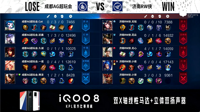 开局济南RW侠边路换线。2分15秒济南RW侠拿下主宰,成都AG拿下暴君。4分13秒济南RW侠野区击杀蔡文姬拿到一血。6分整济南RW侠发育路击杀蔡文姬。6分20秒野区团战双方1换1。8分12秒济南RW侠橘右京野区单杀公孙离。11分55秒济南RW侠拿下暗影暴君并打出1换2。12分18秒济南RW侠中路击杀公孙离。13分30秒济南RW侠摧毁敌方中路外塔。14分39秒济南RW侠拿下暗影主宰。16分12秒济南RW侠拿下暗影暴君。16分59秒发育路团战济南RW侠击杀镜并摧毁发育路高地塔。18分51秒济南RW侠拿下暗影主宰。20分26秒济南RW侠拿下风暴龙王,团战济南RW侠打出0换5,橘右京拿到三连决胜。20分54秒济南RW侠摧毁敌方水晶拿下比赛。