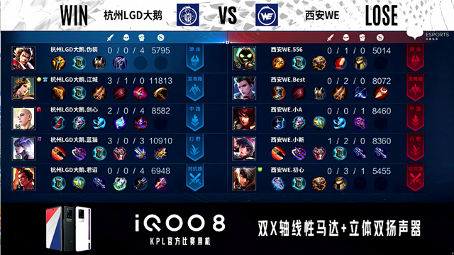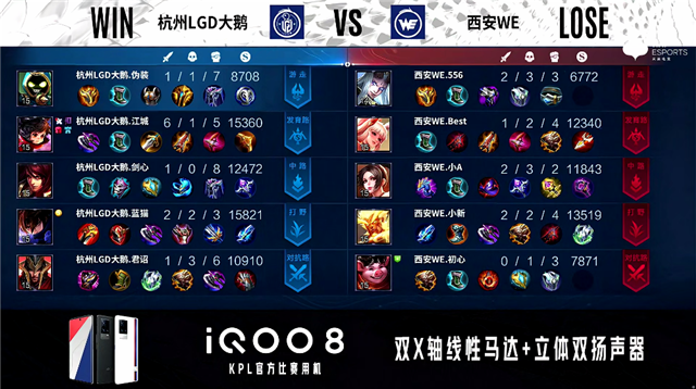 2分06秒,西安WE大乔击杀猪八戒拿下一血。2分33秒,西安WE控下先知主宰,杭州LGD大鹅控下暴君。3分31秒,杭州LGD大鹅马可波罗下路击杀老夫子。4分08秒,双方两处交火,双方1换1。4分32秒,西安WE中路击杀鬼谷子,随后西安WE老夫子推掉杭州LGD大鹅下一塔。5分50秒,西安WE团战打出0换2,杭州LGD大鹅破掉西安WE下一塔。6分53秒,西安WE击杀马可波罗,随后再击杀猪八戒并破掉杭州LGD大鹅上二塔。7分57秒,西安WE击杀鬼谷子。8分20秒,杭州LGD大鹅控下先知主宰。9分05秒,双方团,杭州LGD大鹅打出1换3。9分20秒,杭州LGD大鹅破掉西安WE中一塔。10分15秒,杭州LGD大鹅控下暗影主宰。12分07秒,杭州LGD大鹅控下暗影暴君。13分16秒,杭州LGD大鹅破掉西安WE中二塔,随后破掉西安WE上二塔。14分10秒,双方团,双方1换1。14分50秒,杭州LGD大鹅控下暗影主宰。15分40秒,杭州LGD大鹅上路打出0换2,随后破掉西安WE上高地。16分45秒,双方团战1换1。17分钟,杭州LGD大鹅控下暗影暴君。19分04秒,西安WE破掉杭州LGD大鹅下二塔,杭州LGD大鹅控下暗影主宰。20分20秒,西安WE击杀娜可露露。21分21秒,杭州LGD大鹅娜可露露抢到风暴龙王,随后团战杭州LGD大鹅打出1换5团灭对手。21分59秒,杭州LGD大鹅摧毁西安WE水晶赢下比赛。