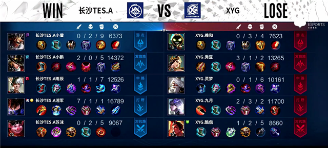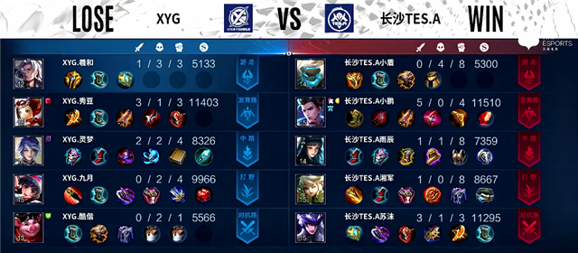 开局XYG入侵野区,沈梦溪拿下一血,双方1换1。1分50秒XYG强攻上路一塔,吕布被击杀。4分钟娜可露露拿下暴君,兰陵王拿下主宰。4分10秒下路团战,长沙TES.A打出2换4,娜可露露拿下三杀。5分20秒娜可露露入侵野区,拿下双杀。5分40秒双方互换边路一塔。6分15秒老夫子推掉上路一塔。6分40秒吕布推掉中路一塔。8分钟长沙TES.A入侵野区,团战打出1换2。8分40秒娜可露露拿下暴君。9分10秒娜可露露拿下主宰。10分20秒娜可露露拿下暴君。10分45秒老夫子推掉上路二塔。11分55秒成吉思汗推掉上路二塔。12分12秒娜可露露拿下主宰。12分30秒上路团战,XYG打出1换4。13分45秒下路团战,长沙TES.A打出1换4。14分17秒长沙TES.A推掉水晶拿下本场比赛胜利。