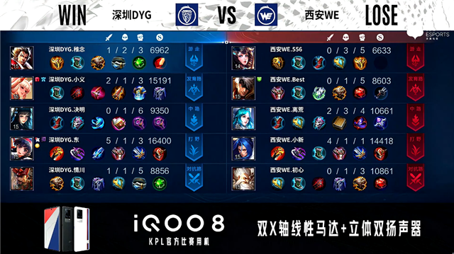 双方常规开局。1分52秒深圳DYG发育路击杀李元芳拿到一血。2分21秒深圳DYG拿下暴君。3分21秒中路团战深圳DYG击杀金蝉。4分07秒深圳DYG对抗路击杀马超。4分21秒西安WE中路击杀鬼谷子。5分40秒深圳DYG拿下主宰。6分40秒中路团战深圳DYG打出1换4,关羽拿到三连决胜。7分12秒深圳DYG摧毁敌方中路外塔。9分14秒西安WE野区打出0换2。9分37秒西安WE摧毁敌方中路外塔。10分23秒西安WE中路打出1换3。12分13秒中路团战深圳DYG打出1换4。12分43秒深圳DYG击杀阿古朵完成团灭。13分10秒深圳DYG摧毁敌方中路、对抗路高地塔。15分26秒野区团战深圳DYG打出1换5。15分57秒深圳DYG摧毁敌方水晶拿下比赛。