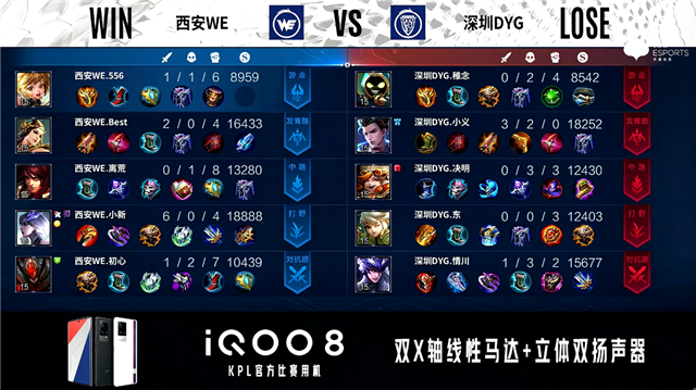 双方常规开局。2分59秒西安WE拿下暴君。3分05秒野区团战双方1换1,深圳DYG拿到一血。7分58秒深圳DYG拿下暴君。9分42秒深圳DYG拿下主宰。10分51秒深圳DYG拿下暗影暴君。12分整深圳DYG摧毁敌方对抗路二塔。12分24秒深圳DYG摧毁敌方发育路二塔。12分42秒西安WE拿下暗影主宰。13分43秒中路团战西安WE打出1换2。14分34秒西安WE摧毁敌方中路外塔。15分05秒深圳DYG中路击杀白起。15分42秒深圳DYG击杀周瑜并拿下暗影暴君。15分58秒深圳DYG摧毁敌方中路外塔。17分14秒深圳DYG拿下暗影主宰。17分48秒深圳DYG摧毁敌方中路二塔。19分54秒西安WE中路击杀沈梦溪。20分26秒西安WE拿下风暴龙王,深圳DYG摧毁敌方对抗路高地塔。20分54秒西安WE对抗路击杀马超。20分03秒团战西安WE击杀太乙真人并摧毁敌方对抗路高地塔。22分47秒西安WE摧毁敌方中路高地塔。24分15秒中路团战西安WE打出0换4。24分33秒西安WE摧毁敌方水晶拿下比赛。