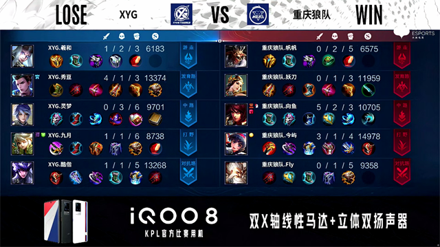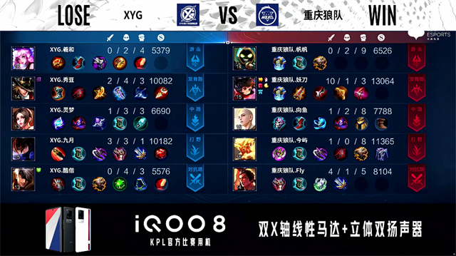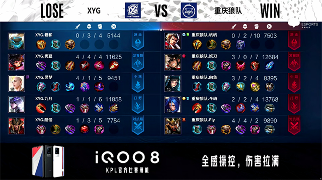 2分22秒,XYG控下暴君,随后团战XYG打出0换3,李元芳拿下双杀。4分01秒,重庆狼队击杀李元芳。4分20秒,XYG破掉重庆狼队上一塔。6分45秒,重庆狼队控下暴君,随后XYG控下先知主宰。7分54秒,重庆狼队破掉XYG上二塔。8分27秒,双方团,重庆狼队打出2换3,关羽拿下三杀。9分钟,重庆狼队破掉XYG下二塔,随后破掉重庆狼队中一塔。11分20秒,重庆狼队控下暗影暴君并击杀蒙恬,随后破掉XYG中二塔。12分23秒,重庆狼队控下暗影主宰。12分45秒,重庆狼队击杀李元芳,随后破掉XYG上高地。13分18秒,双方团战1换1,随后破掉XYG中高地。13分30秒,双方团战再次1换1。15分43秒,重庆狼队控下暗影暴君。16分20秒,重庆狼队团战打出1换2,随后破掉XYG下高地。16分43秒,重庆狼队赢下团战后一波摧毁XYG水晶,3:0赢下比赛。