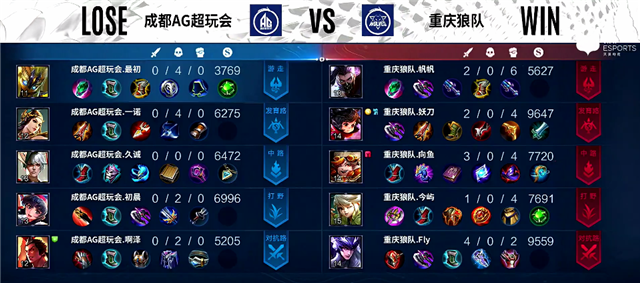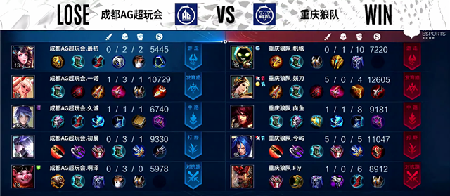 双方和平开局。2分27秒河道交火,镜拿下一血。2分40秒镜拿下暴君。3分钟重庆狼队入侵野区,马可波罗被击杀。3分40秒上路团战,双方2换2。4分40秒河道团战,成都AG超玩会打出0换3,成吉思汗推掉下路一塔,云缨拿下主宰。5分20秒马可波罗推掉上路一塔。5分30秒马可波罗推掉中路一塔。6分50秒野区团战,双方3换3。8分钟云缨拿下暴君。8分30秒下路交火,双方1换1。8分50秒上路团战,成都AG超玩会打出1换2。10分27秒镜拿下暴君,云缨拿下主宰,团战重庆狼队打出0换3。11分钟成吉思汗推掉中路一塔。15分钟镜拿下暴君。16分钟重庆狼队推掉中路高地塔,团战团灭成都AG超玩会。16分38秒重庆狼队推掉水晶拿下本场比赛胜利。