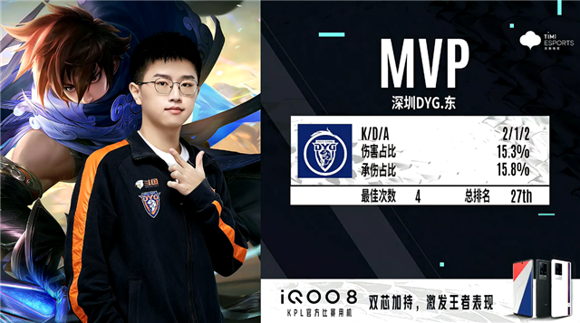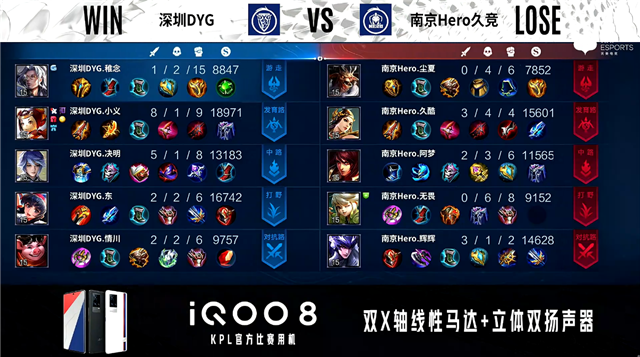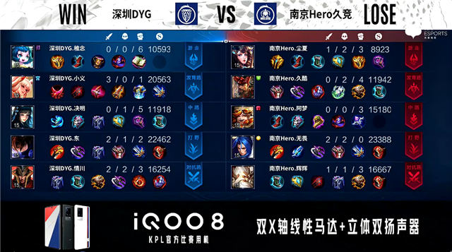 开局南京Hero吕布走中、不知火舞走对抗路。2分11秒深圳DYG拿下暴君。4分22秒南京Hero拿下主宰。5分22秒暴君处团战深圳DYG打出0换2。6分14秒深圳DYG野区击杀裴擒虎。6分36秒深圳DYG对抗路击杀鲁班大师。7分27秒南京Hero野区击杀盾山。8分28秒深圳DYG中路击杀不知火舞。8分54秒深圳DYG摧毁敌方中路二塔。9分02秒深圳DYG摧毁敌方发育路二塔。9分22秒深圳DYG发育路团战打出0换3。9分42秒深圳DYG摧毁敌方发育路高地塔,南京Hero击杀关羽。10分19秒南京Hero中路击杀盾山。10分39秒深圳DYG抢到暗影暴君。14分01秒对抗路团战双方1换1,深圳DYG摧毁敌方对抗路高地塔。16分33秒高地团战深圳DYG打出1换5,狄仁杰拿到三连决胜。16分49秒深圳DYG摧毁敌方水晶拿下比赛。