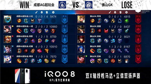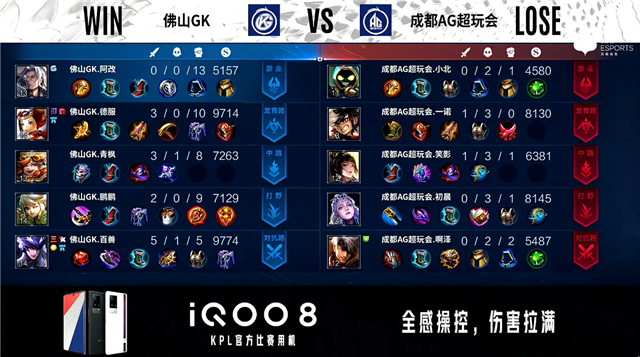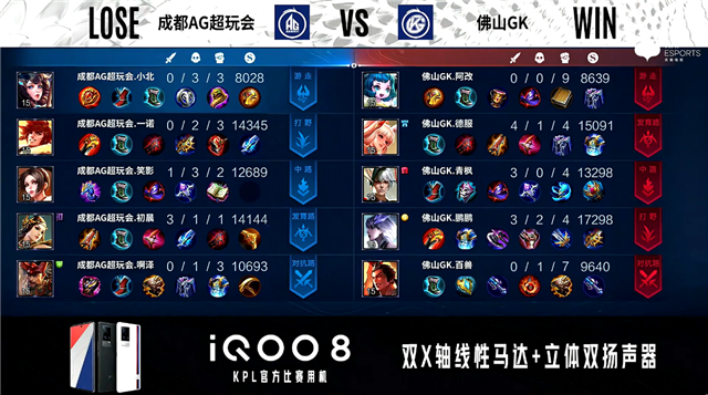 开局成都AG边路换线。2分14秒佛山GK拿下暴君。3分09秒野区团战成都AG击杀橘右京拿到一血。5分25秒双方野区1换1。6分13秒成都AG野区击杀橘右京。6分23秒成都AG摧毁敌方对抗路二塔并拿下暴君。8分10秒成都AG摧毁敌方中路外塔。8分23秒成都AG拿下主宰。9分22秒双方边路1换1。10分13秒成都AG拿下暗影暴君。12分56秒成都AG摧毁敌方中路二塔。13分42秒成都AG高地团战打出0换3摧毁敌方水晶拿下比赛。