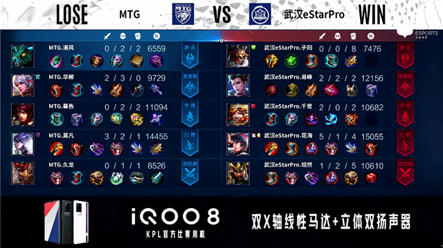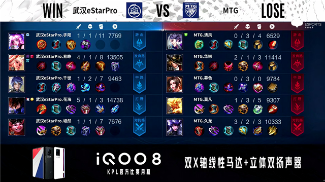 2分14秒,MTG控下暴君。3分49秒,武汉eStar澜下路击杀刘邦拿下一血。4分48秒,武汉eStar下路越塔击杀马可波罗。5分17秒,武汉eStar破掉MTG下二塔。6分26秒,MTG拿下暴君。6分45秒,武汉eStar拿下先知主宰并破掉MTG上二塔。7分15秒,武汉eStar中路打出0换2。7分53秒,武汉eStar中路越塔1换1。8分08秒,武汉eStar野区击杀不知火舞。8分26秒,武汉eStar破掉MTG中一塔,随后团战MTG打出1换4。9分12秒,MTG破掉武汉eStar中一塔。10分26秒,武汉eStar澜拿下暗影主宰。12分05秒,武汉eStar控下暗影暴君。13分21秒,武汉eStar破掉MTG中二塔。14分30秒,武汉eStar破掉MTG下高地。15分42秒,武汉eStar控下暗影主宰。16分16秒,武汉eStar击杀盘古。16分42秒,武汉eStar破掉MTG中高地。16分59秒,武汉eStar破掉MTG上高地。17分26秒,双方团,武汉eStar打出1换4。17分40秒,武汉eStar摧毁MTG水晶先下一城。