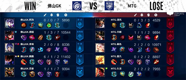 双方和平开局。2分21秒盘古拿下主宰,澜拿下暴君。3分钟中路团战,澜拿下一血。6分30秒嫦娥拿下暴君,澜拿下主宰。7分钟野区团战,MTG打出1换2。7分20秒上路团战,澜被击杀。7分56秒佛山GK上路一塔被破。8分钟MTG上路一塔被破。10分40秒澜拿下暴君,盘古拿下主宰,团战吕布被击杀,MTG推掉中路一塔。13分40秒中路团战,佛山GK打出1换3。15分钟中路团战,佛山GK打出0换4。15分28秒佛山GK推掉水晶率先拿下赛点。