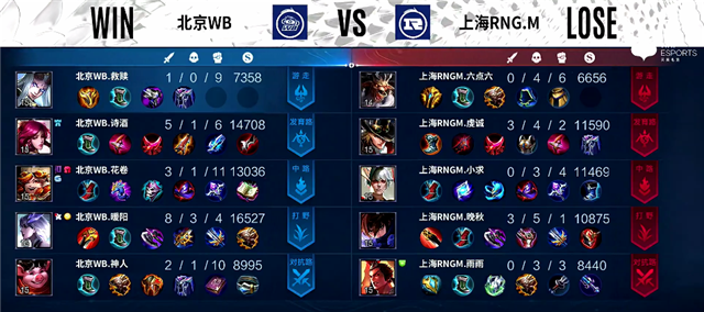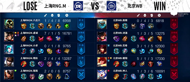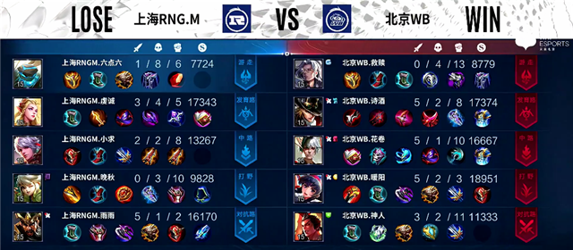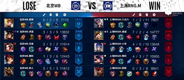 开局双方互相入侵野区换蓝Buff。1分钟太乙真人越塔拿下一血,双方1换1。2分20秒赵云拿下暴君,梦奇被击杀。3分45秒裴擒虎拿下主宰。5分20秒裴擒虎推掉上路一塔。5分42秒周瑜推掉中路一塔,盾山被击杀。7分58秒梦奇拿下暴君,团战盾山被击杀。9分40秒裴擒虎拿下主宰。10分47秒梦奇拿下暴君。11分39秒周瑜推掉中路二塔。11分58秒周瑜拿下主宰。12分10秒中路团战,梦奇被击杀。15分20秒河道团战,赵云被击杀。15分54秒李元芳推掉上路高地塔。16分20秒裴擒虎拿下暴君。17分50秒野区团战,上海RNG.M打出2换4。19分40秒中路团战,北京WB打出1换3,裴擒虎拿下三杀。20分02秒北京WB推掉水晶拿下本场比赛胜利。