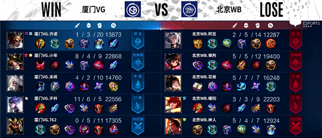 双方和平开局。2分16秒云缨拿下暴君。2分30秒河道团战,关羽拿下一血。3分45秒下路团战,双方1换1。4分钟澜拿下主宰。4分16秒双方互换边路一塔。5分24秒盾山被击杀。5分45秒云缨拿下暴君。8分30秒云缨拿下主宰。9分11秒百里守约推掉中路一塔。9分20秒中路团战,厦门VG打出0换3。12分钟云缨拿下暴君。12分30秒盾山被击杀。14分40秒野区团战,厦门VG团灭北京WB。15分13秒厦门VG推掉水晶率先拿下赛点。