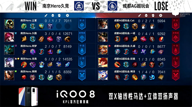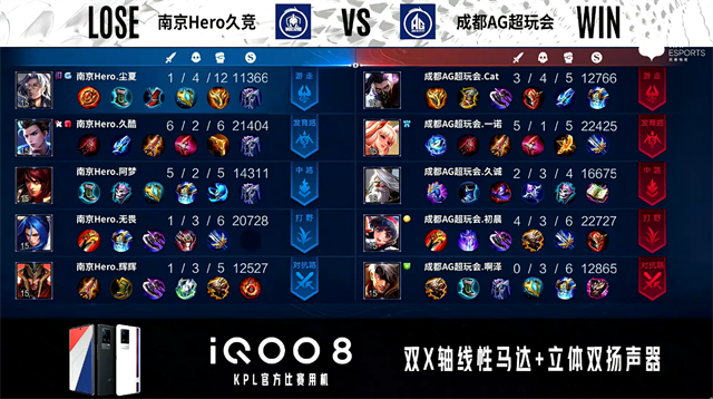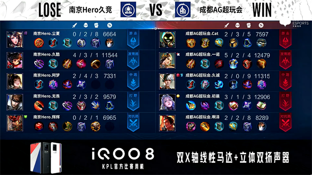 双方常规开局,1分05秒南京Hero拿下中路河道之灵。2分39秒成都AG拿下暴君。2分55秒南京Hero发育路击杀姜子牙拿到一血。3分59秒双方发育路1换1。4分33秒成都AG摧毁敌方发育路外塔。5分20秒双方互换边路外塔。6分03秒南京Hero中路击杀姜子牙。6分26秒成都AG发育路击杀橘右京。6分37秒南京Hero摧毁敌方中路外塔。6分54秒成都AG拿下暴君。8分31秒主宰处团战南京Hero击杀兰陵王。11分25秒发育路团战南京Hero打出1换2。11分50秒野区团战成都AG打出0换3。13分26秒成都AG摧毁敌方中路二塔。14分08秒成都AG拿下暗影主宰。16分30秒成都AG拿下暗影暴君。17分27秒双方发育路1换1。17分59秒成都AG摧毁敌方发育路高地塔。18分56秒成都AG拿下暗影主宰。19分32秒中路团战南京Hero打出1换3。21分34秒中路团战南京Hero打出1换2。23分31秒南京Hero发育路打出0换2。23分39秒成都AG拿下风暴龙王。28分48秒龙王出团战成都AG打出0换5。29分24秒成都AG摧毁敌方水晶拿下比赛。