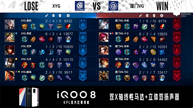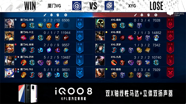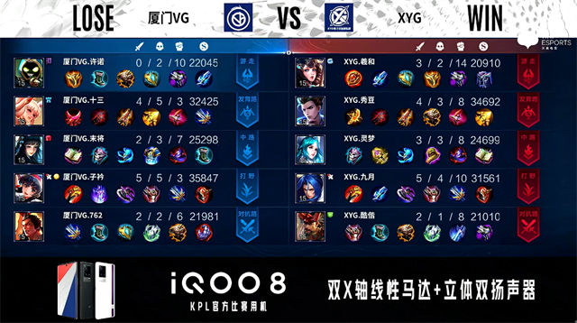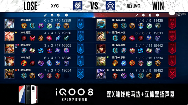 开局厦门VG伽罗中路抢线。2分22秒厦门VG抢到暴君,团战XYG打出1换2。4分14秒厦门VG拿下主宰。4分34秒XYG摧毁敌方发育路外塔。4分55秒XYG野区击杀东皇太一。6分06秒XYG摧毁敌方中路外塔。6分43秒野区团战双方游走互换,XYG拿下暴君。8分27秒XYG拿下主宰。9分48秒对抗路团战厦门VG打出1换4。11分36秒XYG暴君处打出0换3。11分56秒XYG拿下暗影暴君。12分13秒XYG摧毁敌方中路二塔。14分26厦门VG中路打出2换4。14分59秒厦门VG摧毁敌方对抗路高地塔。15分36秒中路团战XYG打出2换3。16分07秒XYG摧毁敌方中路高地塔。16分32秒XYG拿下暗影暴君。16分57秒厦门VG拿下暗影主宰。19分38秒对抗路团战厦门VG打出2换3。19分58秒厦门VG摧毁敌方水晶拿下比赛。