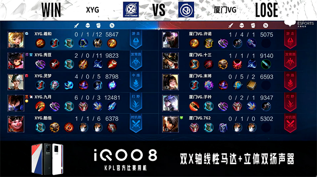 双方常规开局。1分05秒XYG拿下中路河道之灵。2分45秒中路团战XYG击杀盾山拿到一血。3分42秒XYG拿下暴君。6分49秒双方边路外塔互换。9分06秒中路团战XYG打出1换3。10分18秒厦门VG摧毁敌方中路外塔。14分11秒中路团战厦门VG击杀东皇太一。14分37秒厦门VG拿下暗影主宰。15分01秒双方野区2换2。16分37秒XYG抢到暗影暴君,团战厦门VG打出1换2。17分23秒厦门VG摧毁敌方对抗路高地塔。17分32秒厦门VG摧毁敌方中路高地塔。18分51秒中路团战XYG打出3换4,关羽拿到三连决胜。21分20秒对抗路团战XYG打出1换2。22分02秒XYG拿下暗影暴君。22分16秒XYG摧毁敌方中路外塔。22分68秒高地团战XYG打出0换2并摧毁发育路高地塔。23分41秒XYG摧毁敌方中路高地塔。26分18秒龙王处团战厦门VG打出1换2。27分17秒厦门VG拿下风暴龙王。28分09秒厦门VG摧毁敌方发育路高地塔。28分43秒高地团战双方1换1。29分29秒高地团战厦门VG打出3换4,厦门VG虞姬打出四连超凡。30分05秒厦门VG摧毁敌方水晶拿下比赛。