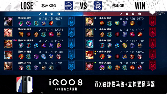 开局佛山GK反掉敌方蓝buff。2分18秒,佛山GK控下暴君。5分11秒,佛山GK狄仁杰下路1v2强行换掉姜子牙。6分20秒,上路团,佛山GK打出1换3。6分55秒,佛山GK破掉苏州KSG上二塔。7分48秒,佛山GK拿下暴君。8分51秒,佛山GK破掉苏州KSG中一塔。9分29秒,佛山GK击杀老夫子,随后破掉苏州KSG下二塔。10分47秒,佛山GK控下暗影暴君,随后秒掉老夫子。11分20秒,佛山GK破掉苏州KSG下高地。11分55秒,佛山GK控下暗影主宰。12分30秒,佛山GK击杀姜子牙,随后破掉苏州KSG中二塔。13分钟,佛山GK镜击杀张飞,随后队伍破掉苏州KSG中高地。13分26秒,佛山GK破掉苏州KSG上高地。13分51秒,双方团战1换1。14分53秒,上路团,佛山GK反打打出2换3。15分46秒,佛山GK剩余三人一波摧毁苏州KSG水晶,3:0赢下比赛!