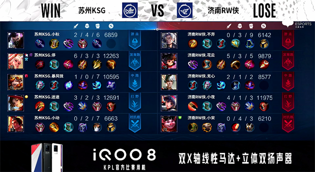 1分57秒,苏州KSG澜击杀姜子牙拿下一血。3分36秒,苏州KSG控下暴君并击杀太乙真人。5分18秒,济南RW侠破掉苏州KSG下一塔并击杀大乔。6分18秒,济南RW侠镜击杀入侵野区的夏侯惇。7分15秒,苏州KSG破掉济南RW侠中一塔。8分45秒,苏州KSG澜拿下暴君,随后团战苏州KSG打出1换2。9分06秒,苏州KSG老夫子大乔破掉济南RW侠上高地。10分25秒,苏州KSG控下暗影暴君。10分47秒,济南RW侠野区击杀苏州KSG两人。11分14秒,济南RW侠控下暗影主宰。12分04秒,济南RW侠五人包下秒掉大乔。12分34秒,下路团,苏州KSG打出0换4,随后破掉济南RW侠下二塔。13分17秒,苏州KSG破掉济南RW侠中二塔。14分59秒,苏州KSG控下暗影暴君。16分46秒,双方团,苏州KSG打出1换3并破掉济南RW侠中高地。17分23秒,苏州KSG团灭对手后破掉济南RW侠水晶拿到赛点。