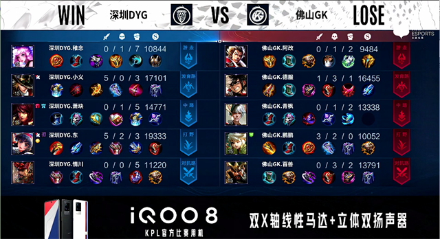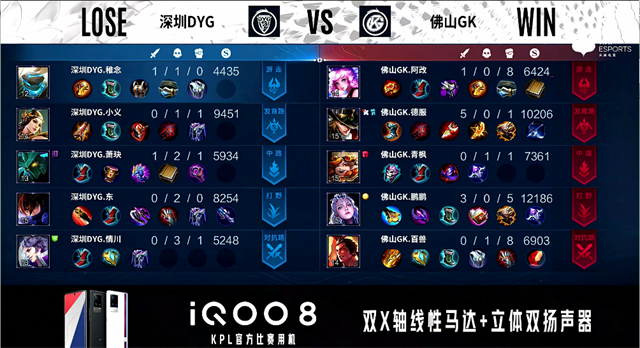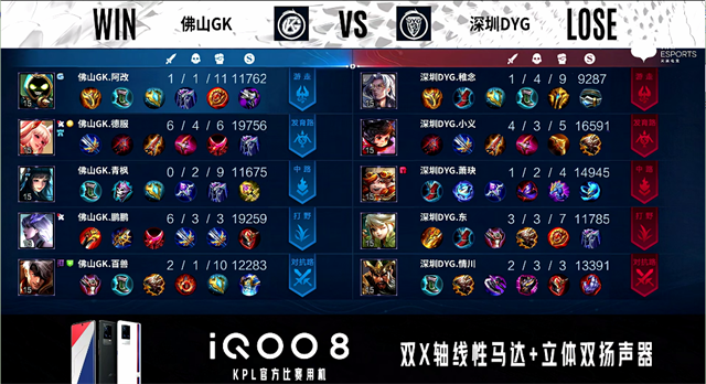 1分40秒,野区团,双方2换2。2分钟,佛山GK破掉深圳DYG下一塔。4分58秒, 佛山GK拿下先知主宰。6分27秒,佛山GK控下暴君。7分22秒,佛山GK兰陵王换掉成吉思汗,随后队伍破掉深圳DYG上二塔。7分48秒,佛山GK再次打出0换2并破掉深圳DYG上高地。8分20秒,佛山GK中路打出0换4并破掉深圳DYG中一塔。9分28秒,佛山GK控下先知主宰。10分09秒,佛山GK控下暗影暴君。10分37秒,佛山GK破掉深圳DYG下二塔。11分28秒,佛山GK控下暗影主宰,随后破掉深圳DYG中二塔。12分26秒,佛山GK先后破掉深圳DYG下、中高地,随后团战佛山GK打出1换3。12分37秒,佛山GK一波摧毁深圳DYG水晶赢下比赛。