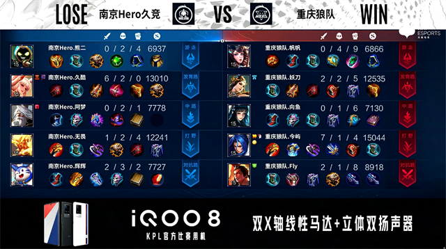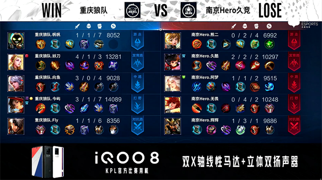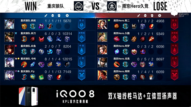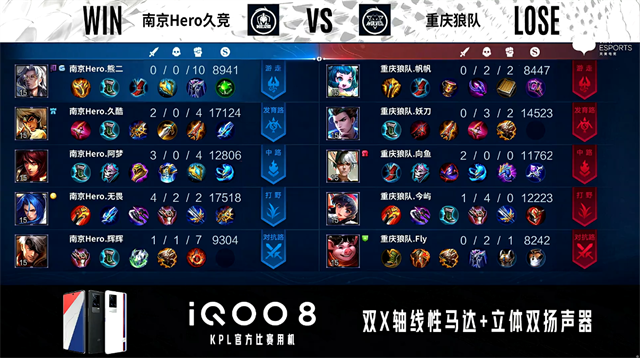 双方常规开局。2分17秒南京Hero拿下暴君。3分05秒南京Hero摧毁敌方发育路外塔。3分26秒重庆狼队中路击杀裴擒虎。6分44秒重庆狼队野区击杀关羽。6分59秒南京Hero拿下暴君。7分10秒南京Hero摧毁敌方中路外塔。7分59秒南京Hero对抗路击杀云缨。8分19秒南京Hero拿下主宰。8分50秒南京Hero野区击杀夏侯惇。9分35秒中路团战重庆狼队打出1换2。12分19秒重庆狼队拿下暗影暴君。12分32秒对抗路团战重庆狼队击杀裴擒虎。14分58秒重庆狼队摧毁敌方中路外塔。15分18秒野区团战重庆狼队打出1换3。15分50秒重庆狼队摧毁敌方中路高地塔,南京Hero边路兵线摧毁敌方两座高地塔。16分48秒重庆狼队暴君处击杀嫦娥。17分06秒重庆狼队发育路击杀裴擒虎。17分18秒重庆狼队团灭对手。17分39秒重庆狼队摧毁敌方水晶拿下比赛。