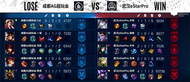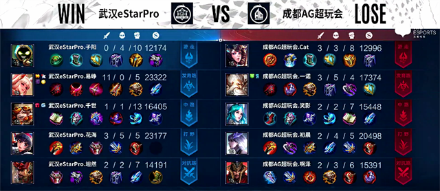 双方和平开局。1分30秒阿古朵入侵野区,马超拿下一血。2分55秒河道团战,马超被击杀。4分30秒狄仁杰推掉下路一塔。4分50秒阿古朵拿下暴君,团战武汉eStarPro打出0换2。6分45秒张飞被击杀。7分钟武汉eStarPro入侵野区,云缨被击杀。8分55秒狄仁杰推掉中路一塔。9分17秒阿古朵拿下暴君。10分35秒暴君团,云缨被击杀,阿古朵拿下暴君。11分21秒马超推掉中路二塔。12分钟武汉eStarPro推掉上路高地塔,团战打出0换2。12分25秒武汉eStarPro团灭成都AG超玩会推掉水晶拿下本场比赛胜利。