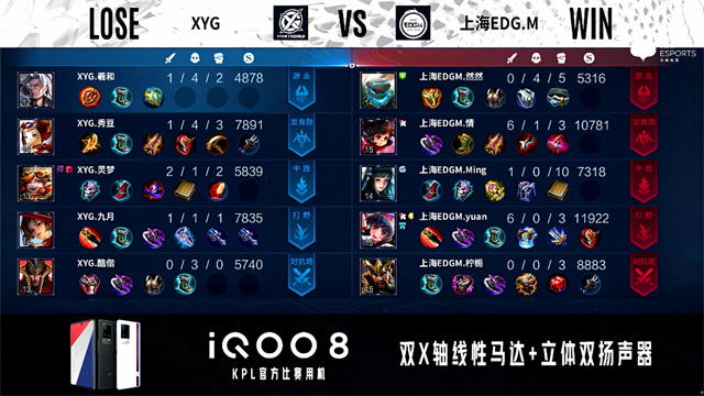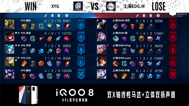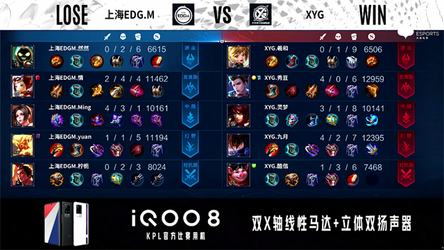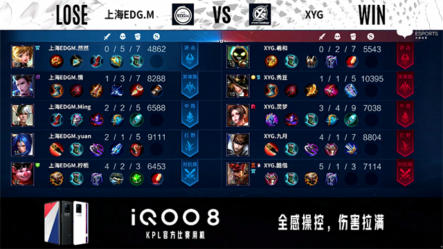 开局上海EDG.M关羽抢到云缨蓝buff。1分51秒,上海EDG.M娜可露露上路击杀云缨拿下一血。2分08秒,上海EDG.M控下先知主宰。2分30秒,下路团,双方1换1。2分58秒,上海EDG.M西施下路击杀鲁班七号。4分10秒,上海EDG.M控下暴君。4分34秒,双方团战2换2。7分13秒,上海EDG.M盾山越塔开团助队伍打出1换3,随后队伍破掉XYG中路两座外塔及上二塔。8分48秒,上海EDG.M破掉XYG下二塔。10分16秒,上海EDG.M控下暗影主宰及暗影暴君。12分01秒,中路团,上海EDG.M打出0换2,随后破掉XYG中高地。12分40秒,上海EDG.M一波摧毁XYG水晶拿到赛点。