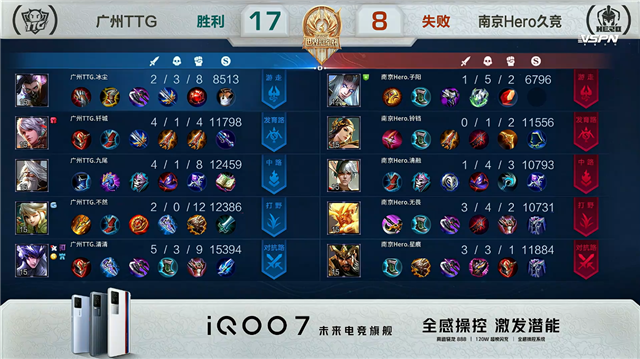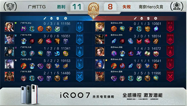 双方常规开局。1分49秒南京Hero对抗路击杀蒙恬拿到一血。2分09秒南京Hero中路击杀西施。2分24秒南京Hero对抗路击杀镜。4分32秒双方互换边路外塔。4分49秒广州TTG野区击杀不知火舞。6分07秒中路团战广州TTG击杀不知火舞。6分28秒广州TTG拿下主宰。8分34秒南京Hero拿下暴君。7分12秒广州TTG中路击杀廉颇。8分21秒广州TTG摧毁敌方中路外塔。8分51秒广州TTG野区击杀不知火舞。10分16秒广州TTG拿下暗影暴君,南京Hero拿下暗影主宰。11分03秒广州TTG中路击杀廉颇。12分28秒广州TTG中路上河道击杀廉颇。13分12秒广州TTG对抗路击杀孙膑。13分37秒南京Hero击杀张飞,广州TTG摧毁敌方对抗路高地塔。14分46秒南京Hero中路下河道击杀西施。15分28秒南京Hero拿下暗影暴君。16分42秒南京Hero不知火舞野区单杀镜。16分50秒南京Hero中路击杀张飞。19分50秒野区团战广州TTG打出0换2。20分30秒南京Hero击杀张飞,广州TTG拿下风暴龙王。22分05秒广州TTG暴君处击杀廉颇。22分33秒广州TTG摧毁敌方发育路高地塔。25分33秒广州TTG野区击杀不知火舞。25分55秒广州TTG拿下风暴龙王。26分14秒广州TTG摧毁敌方中路高地塔。26分26秒广州TTG摧毁敌方水晶拿下比赛。