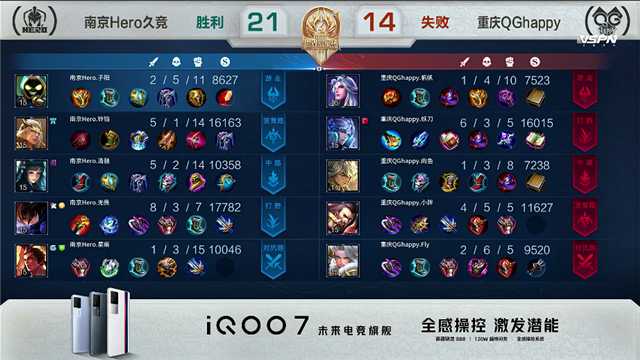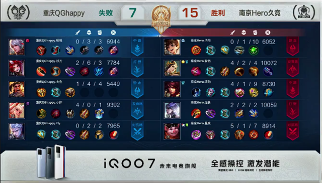 双方和平开局。2分18秒澜拿下暴君,诸葛亮拿下主宰。2分27秒南京Hero久竞入侵野区,西施拿下一血。4分50秒野区团战团战,双方1换1。5分钟后羿推掉下路一塔。65分20秒中路团战,重庆QGhappy打出0换2。6分40秒中路团战,重庆QGhappy打出2换4。7分30秒河道团战,重庆QGhappy打出2换3。7分50秒诸葛亮拿下主宰。8分钟曹操推掉上路一塔。8分36秒太乙真人被击杀。10分钟野区团战,南京Hero久竞打出0换2。10分36秒澜拿下暴君。11分20秒澜拿下主宰。11分34秒后羿推掉上路二塔。12分12秒曹操推掉上路高地塔。12分30秒南京Hero久竞推掉下路高地塔,诸葛亮被击杀。12分45秒后羿推掉中路高地塔。13分10秒钟无艳被击杀。14分钟曹操被击杀。15分10秒澜拿下暴君。15分40秒野区团战,南京Hero久竞打出0换2。16分20秒澜拿下主宰。16分43秒高地团战,重庆QGhappy打出2换3。18分10秒上路团战,南京Hero久竞团灭重庆QGhappy。18分39秒南京Hero久竞推掉水晶拿下本场比赛胜利。
