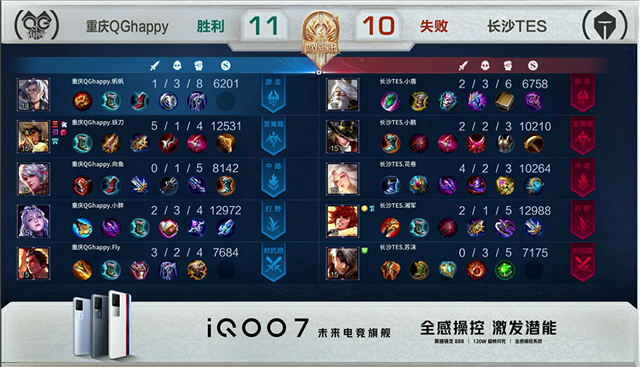 1分53秒,长沙TES花木兰上路击杀梦奇拿下一血。3分16秒,长沙TES拿下暴君。3分56秒,重庆QG强推掉长沙TES中一塔,长沙TES反打打出1换2。6分23秒,中路团,重庆QG打出1换2。7分43秒,长沙TES中路击杀虞姬。9分58秒,双方团,长沙TES打出1换3。10分33秒,长沙TES拿下暗影暴君。11分17秒,长沙TES上官婉儿击杀东皇太一。12分24秒,长沙TES拿下暗影主宰。13分42秒,长沙TES接连破掉重庆QG下、上二塔。14分11秒,长沙TES破掉重庆QG上高地,随后重庆QG击杀盾山。14分52秒,重庆QG拿下暗影暴君。15分18秒,双方团,长沙TES打出,2换3,伽罗拿下三杀。16分40秒,重庆QG拿下暗影主宰,随后团战双方4换4,虞姬拿下三杀。17分28秒,重庆QG虞姬接连破掉长沙TES中二塔及高地。18分35秒,中路团,长沙TES打出2换5团灭对手,花木兰拿下三杀。19分24秒,长沙TES破掉重庆QG水晶赢下比赛。