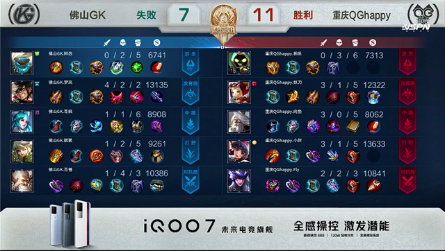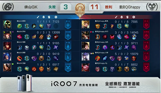 双方平稳开局。1分50秒上路团战,佛山GK打出1换2,兰陵王拿下一血。3分30秒裴擒虎拿下主宰,橘右京拿下暴君。4分钟下路团战,佛山GK推掉下路一塔,鲁班大师被击杀。5分20秒重庆QGhappy入侵野区,裴擒虎被击杀。5分30秒李元芳推掉下路一塔。6分20秒野区团战,重庆QGhappy打出1换2。7分钟,裴擒虎拿下主宰。7分30秒橘右京拿下暴君。9分10秒上路团战,佛山GK打出1换2。9分50秒河道团战,重庆QGhappy打出1换2。10分26秒橘右京被击杀。10分40秒裴擒虎拿下主宰。11分10秒橘右京拿下暴君。15分20秒裴擒虎拿下主宰。15分50秒中路团战,双方1换1。16分35秒裴擒虎拿下暴君。19分05秒下路团战,双方1换1。19分50秒下路团战,佛山GK打出1换3。20分30秒重庆QGhappy边路高地塔被破。21分钟裴擒虎拿下风暴龙王。21分45秒狄仁杰推掉中路高地塔。22分16秒佛山GK推掉水晶扳回一分。